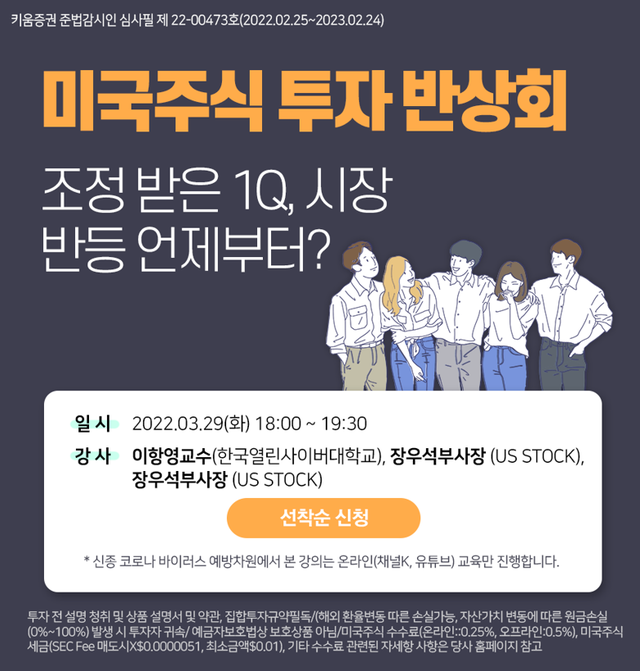 키움증권은 오는 29일 오후 6시부터 90분간 미국주식 투자 반상회 세미나를 개최한다고 25일 밝혔다.이번 미국주식 투자반상회는 한국 열린 사이버 대학교 이항영 교수, US STOCK의 장우석 부사장, 키움증권 글로벌 리서치팀의 안석훈 팀장이 출연한다.세미나를 통해 이들은 조정받는 1분기 시장의 반등은 언제부터일지 예측할 예정이다.세미나 시청은 회사 홈페이지 또는 유튜브 채널에서 가능하다.