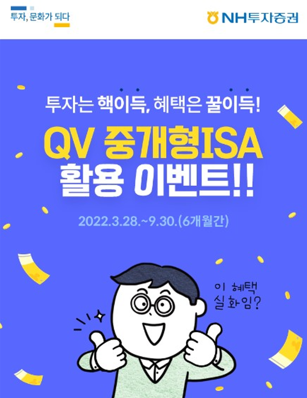 NH투자증권은 신규 가입 및 기존 고객을 대상으로 QV 중개형ISA 활용 이벤트를 진행한다고 28일 밝혔다. 해당 이벤트는 QV 고객이라면 누구라도 참여 가능하며 이날부터 9월 30일까지 진행한다.NH투자증권은 QV 중개형 ISA계좌를 처음 개설하는 고객 전원에게 온라인 국내 주식 매매수수료 우대 혜택을 가입일 기준 2년 제공한다. 또한 스타벅스 아메리카노 모바일 교환권 1매를 1만명 추첨해 제공할 예정이다. 별도 참여 신청 없이 QV 중개형 ISA를 통해 개설, 입금, 금융상품 투자, 적립식 약정 등 다양한 활용을 하면 자동으로 최대 5개 이벤트에 참여할 수 있도록 구성했다.신규 고객뿐만 아니라 QV 중개형 ISA를 이미 개설한 고객도 참여할 수 있다. 300만원부터 2000만원 이상까지 입금 구간별 주유상품권을 추첨 제공하며, 공모펀드 및 공모파생결합증권을 300만원부터 3000만원 이상까지 매수하면 매수 금액에 따라 신세계백화점 상품권을 추첨해 차등 제공한다.공모펀드 및 ETF에 20만원 이상 3년 적립식 약정을 하고 4회 이상 자동이체 불입하면 선착순으로 신세계백화점 상품권을 증정한다. 이번 이벤트는 경품 증정 대상자가 총 2만500명으로 지난해 ISA이벤트 비교해 당첨 인원이 대폭 증가했으며, 모든 이벤트는 중복 참여가 가능해 당첨 확률을 높였다.유현숙 WM사업부 대표는 “중개형 ISA는 비과세 및 저율과세 혜택이 있어 일반 계좌만 보유한 고객은 우선 중개형 ISA의 절세 한도를 최대한 활용하고 남은 금액은 일반 계좌로 투자하는 것이 효율적인 계좌 운영 방법”이라면서 “이번 이벤트는 자산관리의 기본인 절세의 필요성과 효과를 경험할 수 있는 계기를 제공해 중개형 ISA 활용을 통한 고객의 자산관리를 돕는데 목적이 있다”고 밝혔다.