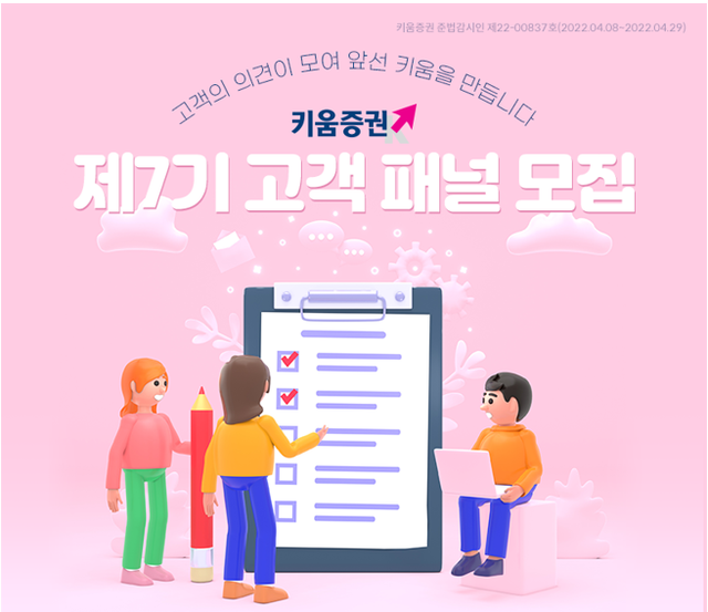 키움증권은 금융소비자와 소통하면서 고객중심 경영을 실천하기 위해 2022년 상반기 ‘제7기 고객 패널’을 오는 29일까지 모집한다고 8일 밝혔다.고객 패널제도는 회사의 금융상품과 서비스 등에 대해 고객의 목소리를 경청하는 소통 창구 역할로 금융소비자보호 및 다양한 고객의 소리(VOC)를 청취하고자 매년 2회 시행하고 있다.이 회사 고객이라면 누구나 지원 가능하다. 패널로 선정된 고객은 다음달부터 1개월간 키움증권의 금융상품 및 서비스, 금융소비자보호 관련 제언 등 다양한 의견을 고객 패널 전용 이메일을 통해 접수하면 된다.우수 제안을 제시한 고객 중 총 7명을 시상하고, 고객 패널로 참여해준 모든 고객에게도 소정의 상품이 지급될 예정이다.회사 관계자는 “고객 패널의 다양한 의견과 아이디어를 경청해 보다 안전하고 편리한 고객 서비스를 제공하고, 제도 개선에도 적극 반영할 계획인 만큼 많은 관심과 지원을 부탁한다”고 말했다.