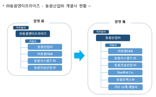 합병 작업이 완료되면 지주사 동원엔터프라이즈가 동원산업에 흡수돼 동원산업이 동원그룹의 지주사가 된다. 스타키스트, 동원로엑스 등 손자회사였던 계열사들은 자회사로 지위가 바뀐다.