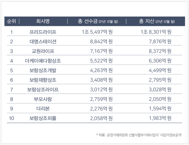 1위 상조업체는 '프리드라이프'로 선수금 1조5497억원, 자산 1조8301억원을 기록했다. 프리드라이프는 지난해 '좋은라이프', '금강문화허브'에 이어 올해 초 '모던종합상조'와의 합병 절차를 마무리하며 상조 4개사의 통합을 완료했다.공정위는 '2022년 1분기 상조업체 주요 변경 사항 공개'를 통해 올해 3월 말 기준 정상 영업 중인 등록 상조업체는 73개사라고 밝혔다.