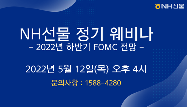 NH선물은 올해 하반기 FOMC와 금리 동향을 전망하는 웨비나(온라인 세미나)를 유튜브 라이브 방송을 통해 오는 12일 오후 4시부터 1시간 동안 진행한다고 10일 밝혔다.
