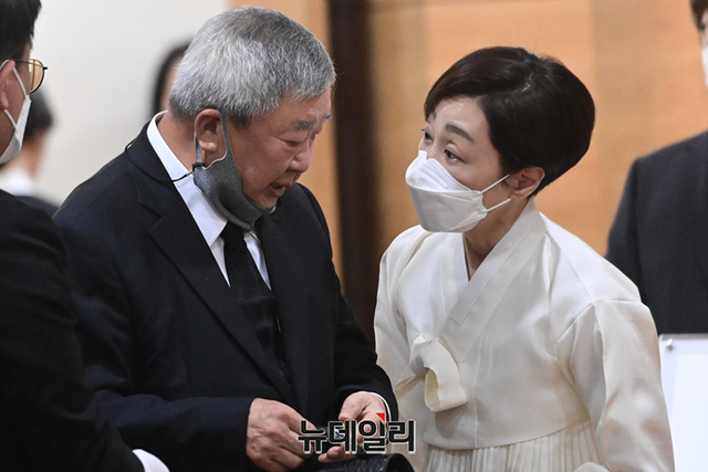 구지은 아워홈 부회장이 12일 오후 서울 송파구 서울아산병원 장례식장에 마련된 구자학 아워홈 회장의 빈소를 찾은 구본능 희성그룹 회장을 배웅하고 있다.