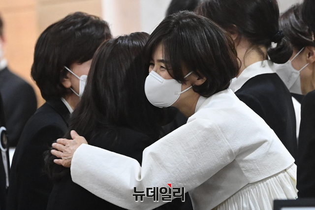 구자학 아워홈 회장의 장녀 미현 씨가 12일 오후 서울 송파구 서울아산병원 장례식장에 마련된 구 회장의 빈소에서 이부진 호텔신라 사장을 배웅하고 있다.