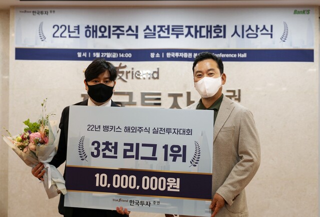 한국투자증권은 지난 27일 여의도 본사에서 ‘2022년 해외주식 실전투자대회’ 시상식을 개최했다고 30일 밝혔다.지난 2월부터 8주에 걸쳐 진행된 이번 실전투자대회에는 6800명이 참가했다. 예탁자산 규모에 따라 ▲3000만원 리그 ▲1000만원 리그 ▲소액리그로 진행됐다. 특히 MZ세대의 관심 증가를 반영해 이번 대회에서 신설한 소액리그에는 약 3000명이 참가했다.시상식에는 대회 기간 74.5%로 가장 높은 수익률을 기록한 김양호 씨가 참석해 상금 1000만원을 받았다. 이밖에 우수한 투자성과를 낸 참가자에게 총 3400만원의 상금을 지급했다. 대회 기간 추첨을 통해 경품을 증정했다.김성환 개인고객그룹장은 “고객과 해외주식에 관심 많은 MZ 세대에게 다양한 실전 거래 경험을 제공하기 위해 대회를 마련했다”라며 “향후에도 투자자에게 도움이 될 수 있는 다양한 서비스와 프로그램을 제공할 것”이라고 말했다.