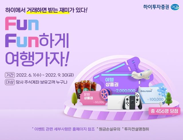 하이투자증권은 오는 9월 30일까지 국내 및 해외주식 매매 고객을 대상으로 경품 이벤트를 진행한다고 2일 밝혔다.이번 이벤트는 2개월씩 총 2회로 구분해 진행된다. 이벤트 신청 고객에게 응모권 1매를 즉시 지급하며, 주식을 매매할 경우에는 매매금액 100만원당 1매의 응모권을 추가로 지급한다.미국 및 홍콩 주식 등 해외주식을 매매할 경우에는 응모권을 2배로 지급한다.취합된 응모권은 고객이 직접 희망하는 여러 경품에 자율적으로 응모하거나 자동으로 한 경품에 집중적으로 응모할 수 있다.추첨을 통해 200만원 여행상품권, 닌텐도 스위치 등 각종 경품을 지급한다. 경품별로 실시간 경품 응모 경쟁률을 공지해 경품 응모의 재미를 더한다.이벤트는 하이투자증권 주식 계좌를 보유한 개인 고객이 회사 홈페이지 내 이벤트 게시판이나 HTS, MTS를 통해 신청 시 참여 할 수 있다. 계좌가 없는 고객의 경우 이벤트 기간 내 계좌 개설 후 이벤트 신청 시 참여가 가능하다.중복 당첨될 경우 높은 가액의 경품으로 선정해 지급한다.이벤트와 관련된 보다 자세한 사항은 회사 홈페이지를 참고하거나 디지털컨택트센터에 문의하면 된다.