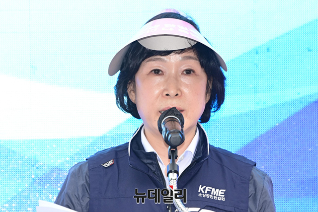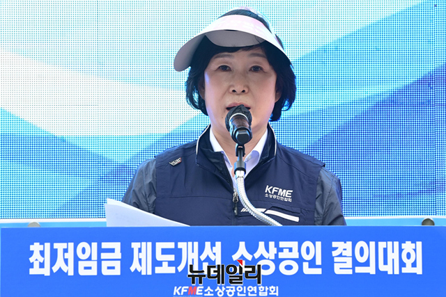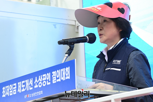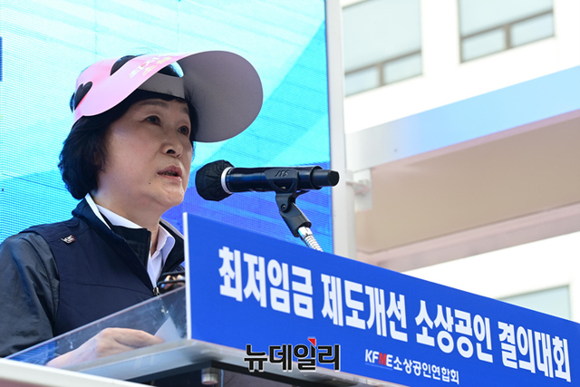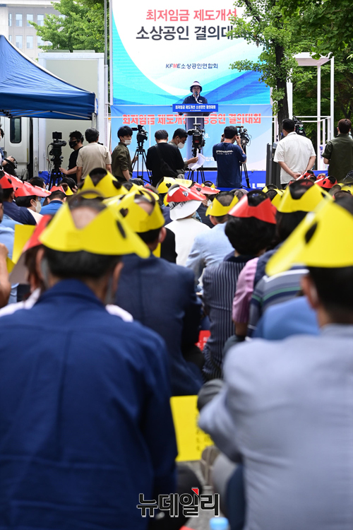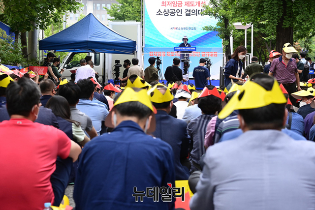 오세희 소상공인연합회 회장이 8일 오후 서울 여의도 국회의사당역에서 열린 제1차 최저임금 제도개선 촉구 결의대회에서 발언을 하고 있다.연합회는 "업종별 및 지역별로 최저임금을 차등화해 사업주의 임금 부담을 줄여야 한다"며 "문재인 정부에서 최저임금이 대폭 상승해 임금 지급 능력이 떨어지는 일부 업종이 고사 위기에 몰려있다"고 주장했다. 이어 "16일 세종시에서 제2차 결의대회를 개최할 예정이다"고 말했다.결의대회에는 회원 단체 및 전국 시·군·구 소상공인과 영업자 등 약 500명이 참석했다.