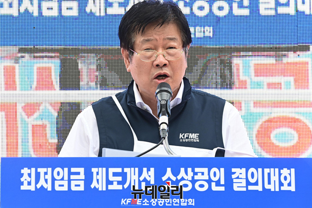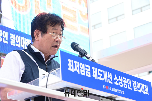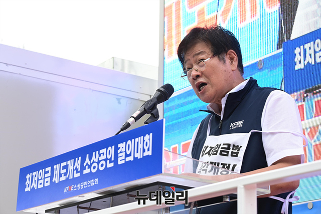 • 정경재 대한숙박협회 회장이 8일 오후 서울 여의도 국회의사당역에서 열린 제1차 최저임금 제도개선 촉구 결의대회에서 발언을 하고 있다.