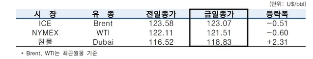 10일 한국석유공사에 따르면 9일(현지시간) 뉴욕상업거래소(NYMEX)의 미국 서부텍사스산원유(WTI) 가격은 전일대비 배럴당 0.60 달러 하락한 121.51 달러에 마감됐다.영국 브렌트유(Brent) 가격은 배럴당 0.51 달러 떨어진 123.07 달러를, 두바이유(Dubai)는 2.31 달러 오른 118.83 달러에 마감됐다.이날 국제유가는 상하이 일부 지역 재봉쇄 등으로 하락했다. 다만 중국 수출 증가 및 석유제품 수요 강세 등은 하락폭을 제한했다.중국 상하이시 민항구에서 확진자 발생으로 해당 지역이 재봉쇄됐다. 지난 1일 상하이 봉쇄 해제 이후 구 단위의 지역이 재봉쇄된 것은 최초다.상하이시는 봉쇄구역 외에서 6명의 확진자가 발생했는데, 이 중 3명은 같은 미용실에서 근무하는 미용사로서 약 500여명의 고객과 접촉했다고 발표했다. 당국은 11일 민항구 전 주민 260만명을 대상으로 PCR 검사를 시행하며, 검사시점까지 봉쇄를 시행할 예정이다.중국 해관총서에 따르면 5월 중국 수출은 3083억달러를 기록, 전년 동기대비 16.9% 증가해 시장 예측치(8%↑)를 대폭 상회했다.상하이 항의 컨테이너 처리량은 방역 조치로 인해 4월에 큰 폭으로 감소하였던 바 있으나 5월 하순에는 정상 수준의 95.3%까지 회복했다.시장 참여자들은 중국 제조업 가동 및 수출입 물류가 회복될 경우 글로벌공급망 충격이 완화될 수 있을 것으로 기대하고 있다.