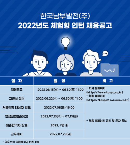 한국남부발전(사장 이승우)이 오는 30일까지 부산, 하동, 인천, 제주, 영월, 안동, 삼척, 세종 등 8개 지역에서 5개월간 근무할 체험형 인턴 118명을 모집한다고 20일 밝혔다.서류전형, 면접전형 순으로 진행되는 인턴 채용은 서류전형에서 2배수를 선발, 온라인으로 진행되는 비대면 면접을 통해 최종 선발된다.이번 체험형 인턴 채용은 사무, 기술 2가지 분야로 선발할 예정이며 5개월 근무기간 동안 개근, 근무평가 B이상 등 수료기준을 충족할 경우 향후 남부발전 정규직 채용 시 서류전형 5% 가점을 부여한다.인턴 지원은 모집 전용 홈페이지(https://kospo2.saramin.co.kr)에서 가능하며, 기타 자세한 사항은 회사 홈페이지(https://www.kospo.co.kr)내 채용정보 게시판에서 확인할 수 있다.남부발전 관계자는 "이번 체험형 인턴의 근무기간이 5개월이므로 충분한 직무경험을 제공할 수 있을 것으로 기대하고 있다"며 "평소 공기업에 관심이 있는 취업준비생의 많은 지원을 바란다"고 말했다.