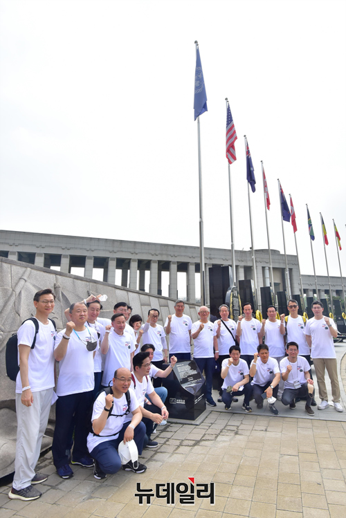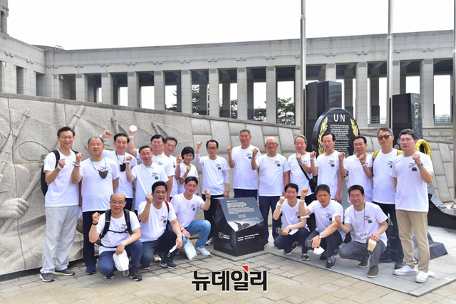신명호 부영그룹 회장과 권오성 대한민국육군협회 회장을 비롯한 참석자들이 25일 오전 서울 용산구 전쟁기념관에서 열린 리버티 워크에서 기념촬영을 하고 있다.