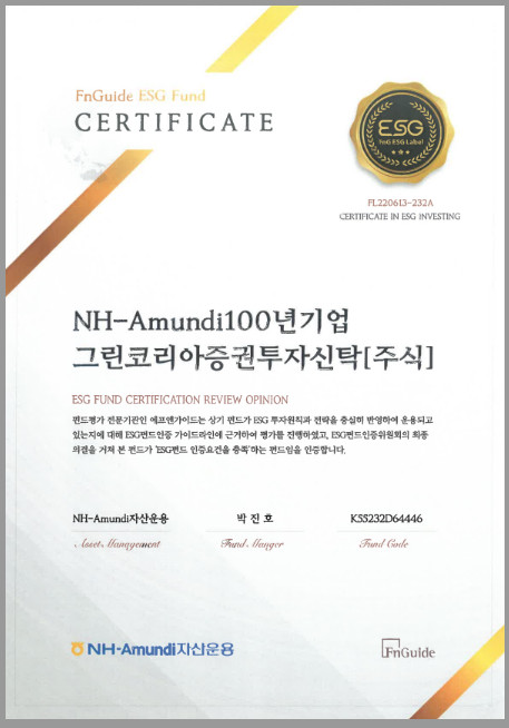 NH아문디자산운용은 ESG 주식형 펀드인 NHNH아문디 100년기업 그린코리아 펀드가 펀드평가사 에프앤가이드에서 국내 최초 ESG 공모펀드 인증을 받았다고 28일 밝혔다.