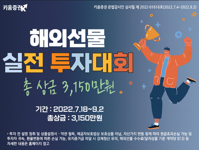 키움증권은 총 상금 3150만원 규모 ‘해외선물 실전투자대회’를 진행한다고 4일 밝혔다.참가 기간은 7월 4일부터 8월 26일까지이며, 대회 기간은 7월 18일부터 9월 2일까지다. 해외선물옵션 계좌 보유 고객이라면 누구나 대회에 참가할 수 있다.총 7주간 7개의 배틀로 진행되는 금번 실전투자대회는 수익률 상위 참가자뿐만 아니라 수익금 상위 참가자도 시상하는 방식으로 진행된다.배틀별 수익률 상위 3명 및 수익금 상위 3명에게 최대 100만원을 순위에 따라 차등 시상한다. 배틀별 시상은 주간 기준이므로 참가자들은 매주 새로운 도전을 할 수 있다. 대회 참가자에 한해 수익률 상위 참가자들의 전일자 매매 내역과 거래 상위 종목 정보를 제공한다. 또한 매주 거래량 상위 1명에게는 현금 50만원을 증정한다.비대면 계좌 보유 고객이라면 해외선물옵션 수수료를 계약당 2.5달러로 할인해주는 혜택도 받아볼 수 있다.이에 대한 자세한 내용은 홈페이지나 키움금융센터를 통해 확인 가능하다.