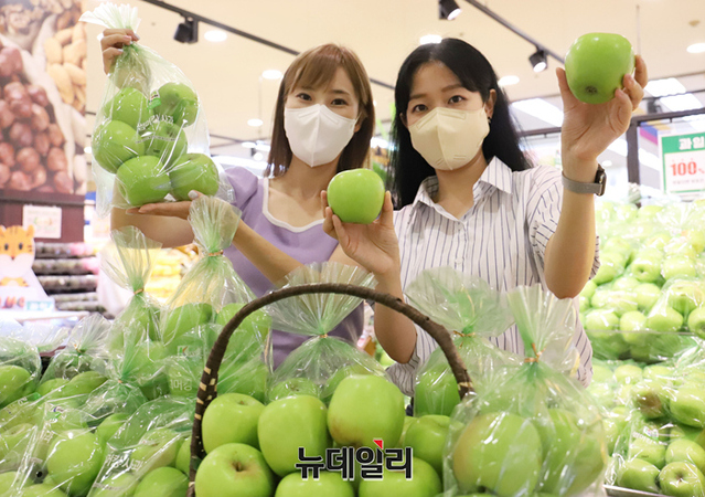 롯데마트가 22년 햇사과 ‘썸머킹 사과’를 첫 출하해 제타플렉스점, 서울역점 등 7개점에서 선보인다.'썸머킹 사과'는 국산 품종을 활성화시키는 롯데마트의 ‘K-품좀 프로젝트’를 통해 출시한 상품이다. 과즙이 풍부하고 조직감이 우수해 식미가 좋은 것이 특징이다. 특히 ‘썸머킹 사과’는 해외 종자 사용에 따른 로열티 부담이 없기 때문에 타 상품 대비 합리적인 가격으로 선보일 수 있다.롯데마트는 7월 중순까지 전점으로 ‘썸머킹 사과’ 판매를 확대할 예정이다. ‘썸머킹 사과(5~8입/봉)’를 9990원. (사진=롯데쇼핑)