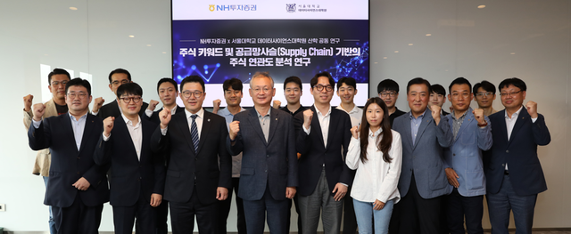 NH투자증권은 서울대학교 데이터사이언스대학원과 지난해부터 공동으로 추진한 ‘주식 키워드 및 공급망 사슬 기반 주식 연관도 분석 연구’를 성공적으로 종료했다고 13일 밝혔다.NH투자증권은 지난 8일 정영채 사장과 오민환·박현우 서울대 교수 및 임직원 등이 참석한 가운데 공동연구 종료 행사를 개최했다.이 회사는 이번 산학 공동연구를 통해 국내 금융투자업권 최초로 기업 간 공급망 사슬 데이터 활용 및 비정형 데이터 결합을 통해 주식 지식그래프를 구축했고, 이를 바탕으로 향후 인공지능(AI) 대고객 투자 정보 서비스를 제공할 계획이다.데이터사이언스대학원은 이번 연구에 대해 기존의 단순 시계열성 정보분석 위주의 데이터 제공에서 벗어나 공급망 데이터 등 기존 증권사에서 고려하지 않은 정보를 다른 비정형 데이터 분석 결과와 결합한 새로운 형태의 연구라고 설명했다.▲뉴스·공시 데이터를 분석해 주식 키워드와 기업 간의 연관 정보 추출 ▲추출 키워드와 공급망 사슬을 결합한 지식 그래프 기반 도출 ▲고객 중심의 종목 검색 지원을 위한 주식정보 산출 방법 연구를 수행했다.이번 연구 결과를 바탕으로 서비스가 출시되면 이 회사 고객들은 시황을 반영하는 종목별 키워드와 산업 생태계를 활용한 깊이 있는 정보들을 손쉽게 확인할 수 있다. 이를 통해 기업 관계와 최신 이슈를 고려한 AI 기반 투자 정보를 활용해 주식 투자를 할 수 있다.정영채 사장은 “방대한 데이터를 보유한 금융회사와 데이터 분석 기술을 보유한 연구기관의 협업을 통한 성공적인 금융혁신 사례”라며 “앞으로도 우수 연구기관과의 공동연구 등을 통해 신기술 기반의 다양한 서비스를 제공할 수 있도록 디지털 역량을 키울 것”이라고 말했다.