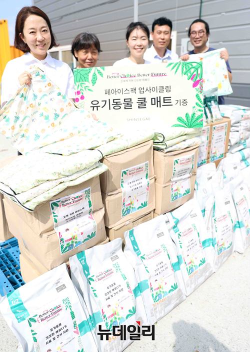[포토] 신세계百, 유기동물 보호센터에 업사이클링 쿨패드 기부