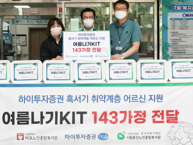 하이투자증권은 윤리경영과 사회공헌 활동의 일환으로 서울 창전동 마포노인종합복지관에서 ‘에너지 취약계층 대상 여름나기 키트’ 전달식을 가졌다고 18일 밝혔다.DGB금융그룹이 매년 무더위 극복을 위해 진행하는 DGB블루윈드에 동참하고자 마련한 이번 활동은 마포구와 용산구 지역 내 에너지 취약계층인 홀몸 어르신들의 건강한 여름나기를 지원하기 위해 기획됐다.하이투자증권은 이날 박춘호 경영전략본부장과 마포구 노인종합복지관 장천식 관장, 용산구 노인종합복지관 조혜진 관장 등 지역 복지사업 관계자들이 참석한 가운데 고급 여름인견이불, 쿨토시, 쿨스카프, 소형선풍기 등 7만원 상당의 혹서기 물품으로 구성된 키트를 기증했다.기부된 키트는 마포구와 용산구 지역의 에너지 취약계층인 143가구에 전달될 예정이다.홍원식 대표이사는 “지치기 쉬운 무더운 여름에도 나눔의 의미를 되새기며 안전하고 건강한 환경 속에서 우리의 이웃이 행복한 삶을 영위할 수 있도록 지속적인 관심으로 ESG경영의 사회공헌 활동을 이어가겠다”고 밝혔다.