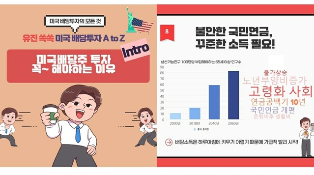 총 10회 분량의 이번 콘텐츠는 기초 개념부터 종목 소개뿐만 아니라 실전 투자 노하우까지 미국 배당주 투자에 대한 풍성한 정보가 담겨 있다. 해외주식 초보 투자자도 쉽게 이해할 수 있도록 다양한 그래픽 요소를 활용해 카드뉴스와 동영상 형태로 재미있게 풀어냈다.