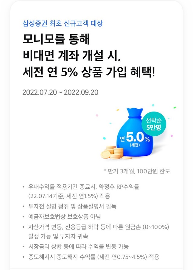 삼성증권은 20일부터 삼성금융 통합앱인 모니모에서 신규로 증권 계좌를 개설하는 고객을 대상으로 세전 연 5%의 수익을 얻을 수 있는 특판RP(환매조건부채권)를 선착순으로 판매하는 이벤트를 진행한다고 밝혔다.이번에 모니모에서 판매하는 삼성증권 특판RP는 만기 3개월, 세전 연 환산 금리 5% 상품으로, 선착순 5만명을 대상으로 인당 100만원 한도로 가입할 수 있다.이 상품은 9월 20일까지 모니모에서 신규 비대면 계좌를 개설한 사람에 한해 그달 30일까지 판매가 진행될 예정이지만 특판RP의 한도가 소진되면 조기 종료될 수 있다.