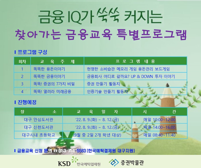 한편 금융교육을 희망하는 기관·단체는 예탁결제원 대구지원으로 문의하면 된다.