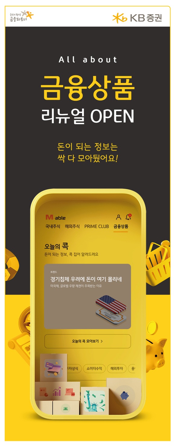 KB증권 지난 15일 모바일트레이딩시스템(MTS) M-able(마블)의 금융상품 홈 화면을 리뉴얼 했다고 16일 밝혔다.금융상품 홈 화면은 주식거래 외에 KB증권에서 거래할 수 있는 모든 금융상품을 모아놓은 화면이다.이번 리뉴얼을 통해 초보 투자자들도 쉽게 이해할 수 있도록 ‘매수·개설’ 등의 금융상품 관련 낮선 용어들을 ‘사러가기·만들기’ 등의 쉬운 표현으로 바꿨다. 또 심플한 디자인을 적용해 고객 친화적으로 UX·UI를 개선했다.또한 금융상품별 Gate페이지, MY페이지 화면을 신설해 직관적으로 금융상품 정보를 확인할 수 있게 했다. 금융상품 홈 화면에 검색창을 추가해 검색어와 관련된 금융상품과 금융정보를 통합적으로 제공한다.특히 투자 경험이 부족한 고객에게 어렵게 느껴질 수 있는 금융상품이나 금융서비스를 보다 쉽고 재미있게 다가갈 수 있도록 새로운 금융 콘텐츠를 강화했다.회사는 투자 경험이 많은 고객에게도 자산관리에 도움이 되는 콘텐츠를 제공하기 위해 ‘오늘의 콕’ 이라는 금융 콘텐츠 메뉴를 새롭게 선보인다.오늘의 콕은 ▲연금계좌, 중개형ISA 계좌 등의 포트폴리오 운용 실전팁을 제공하는 쇼미더수익 ▲채권, 발행어음, ETF 등의 실전 투자법을 3분으로 요약 제공하는 투자상식 ▲시장에 대한 시의성 있는 이야기를 제공하는 트렌드 ▲글로벌 시장상황에 어떠한 전략으로 안전하게 자산배분을 할 수 있는지 이야기하는 해외투자 등을 비롯해 절세전략, 부자, 부동산 등 자산관리에 필수적인 정보를 제공한다.하우성 M-able Land Tribe장 전무는 “증권사 MTS는 개인투자자 사이에서 이미 보편화된 생활 금융 플랫폼으로 자리매김한 상태”라며 “이번 리뉴얼을 통해 고객과의 소통을 확대하고 플랫폼에 머무는 시간도 늘리는 ‘온드 미디어(Owned Media) 전략’으로 콘텐츠 경쟁력을 강화하고자 한다”고 말했다.