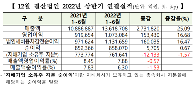 코스피 상장사들이 금리 인상과 인플레이션에 따른 경기 둔화 전망에도 안정적 성과를 내면서 상반기 역대 최대 매출, 영업이익, 순이익을 기록했다.18일 한국거래소가 발표한 ‘유가증권시장 12월 결산법인 2022년 상반기 결산실적’에 따르면 올해 상반기 코스피 상장사들의 연결 매출액은 1361억8708억원으로 전년 동기 대비 25.09% 증가했다.같은 기간 영업이익은 107조3084억원, 순이익은 85조8070억원으로 각각 16.68%, 0.67% 늘었다.반면 영업이익률은 7.88%로 전년 대비 0.57%포인트 하락했다. 순이익률은 6.30%로 1.53%포인트 하락했다. 영업이익률이 하락한 것은 기업들의 영업활동에서 비용이 크게 증가한 것으로 분석된다.코스피 상장사 매출액 비중 11.38%를 차지하는 삼성전자를 제외해도 연결 매출액은 1206조8857억원으로 전년 대비 25.77%, 영업이익은 790조900억원으로 12.96% 증가했다. 하지만 순이익은 63조3836억원으로 같은 기간 7.42% 감소했다.연결부채비율은 118.28%로 상반기 동안 1.98%포인트 증가했다.상반기 연결재무제표 기준 분석대상 603개사 중 반기순이익 흑자 기업은 484개사로 전년 동기(503개사) 대비 20개사 감소했다.업종별로 보면 올 상반기 운수창고업, 화학 등 17개 업종에서 매출이 증가한 것으로 나타났다.영업이익의 경우 운수창고업, 운수장비 등 15개 업종에서 영업이익이 증가한 반면, 건설업 등 2개 업종에서 영업이익이 감소한 것으로 나타났다.순이익은 운수창고업, 운수장비 등 12개 업종은 증가한 반면 서비스업, 건설업 등 5개 업종은 감소했다.금융업 실적은 감소했다. 전 세계적 인플레이션에 따른 금리 인상, 증시 부진 등의 여파다. 상반기 금융업 43개사의 영업이익과 순이익은 전년 동기 대비 각각 8.58%, 7.47% 감소했다.순이익의 경우 금융지주(4.86%), 은행(0.67%) 증가했지만, 증권(-43.44%), 보험(-11.32%) 감소했다.분기 실적을 보면 금융업 43사의 2분기 영업이익과 순이익은 1분기 대비 각각 15.49%, 14.36% 증가한 것으로 집계됐다.업종별로 보면 금융지주의 영업이익은 2분기 동안 31.77% 증가한 반면 은행(-12.94%), 증권(-21.76%) 감소했다. 당기순이익 역시 금융지주는 15.49% 증가한 반면 은행(-14.28%), 증권(-14.84) 줄어든 것으로 나타났다.