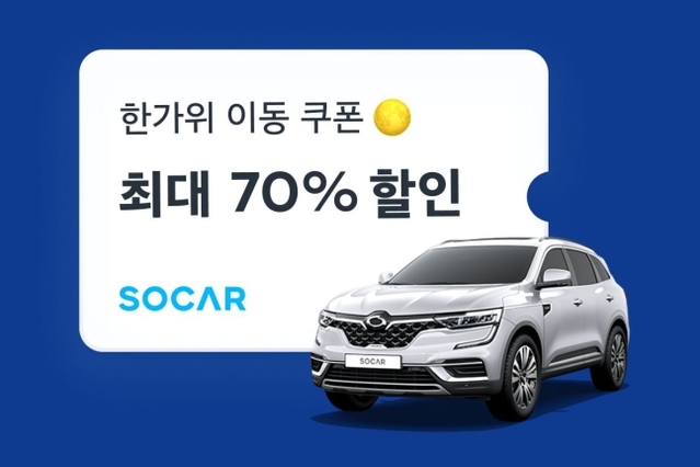 쏘카가 추석 연휴 동안 차량을 장기간 대여하는 이용자들을 대상으로 대여료를 최대 70%까지 할인한다고 31일 밝혔다.쏘카는 9월 8일까지 추석 연휴 기간에 사용할 수 있는 4종의 쿠폰팩을 발급한다. 쿠폰은 대여 기간에 따라 5일(96시간~120시간)과 7일(120~168시간)로 구분되고, 제주 지역을 제외한 전국 모든 지역에 사용할 수 있다.쿠폰팩은 5일 중형 미만 쿠폰 15만9000원, 5일 중형 이상 쿠폰 17만9000원, 7일 중형 미만 쿠폰 18만9000원, 7일 중형 이상 쿠폰 21만9000원 등 총 4종으로 구성됐다. 연휴 다음날인 13일 대여가 종료되는 예약 건에 한해 모든 이용자에게 자동 발급된다.쏘카 측은 "추석 쿠폰팩을 이용하는 경우 쏘카존에 가지 않아도 원하는 시간과 장소에서 차량을 대여하고 반납할 수 있는 '부름 서비스'를 무료로 제공한다"며 "지난 설 연휴 쏘카 이용 데이터에 따르면 4일 이상의 장기 대여건은 전체 예약의 23.3%를 차지한 가운데 38.2%는 부름 서비스를 이용한 것으로 나타났다"고 덧붙였다.