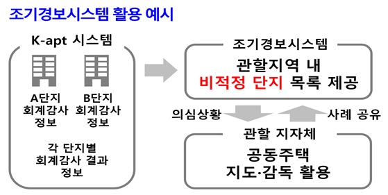 국토교통부는 지난 1월 구축한 공동주택관리비리 조기경보시스템을 8개월 운영한 결과 다수 지자체에서 적극 활용하고 있는 것으로 나타났다고 밝혔다.27일 국토부에 따르면 조기경보시스템은 한국부동산원이 국토부로부터 위임받아 운영중으로 지자체 관할구역내 공동주택 관리비, 입찰내역, 회계감사 결과 등 상세내역을 조회·관리할 수 있다.국토부는 공동주택 관리비리를 사전예방할 수 있도록 K-apt(공동주택관리정보시스템)에서 수집하고 있는 자료를 바탕으로 조기경보시스템을 구축한다.조기경보시스템에서는 공동주택 관리·감독을 위한 총 31개항목 이상징후 데이터를 상시 제공하고 있으며 이상징후뿐아니라 지자체별 실태조사(감사) 처분, 주요적발 사례, 조치현황 등을 등록해 다른 지자체와 지도·감독사례를 공유할 수 있다.
