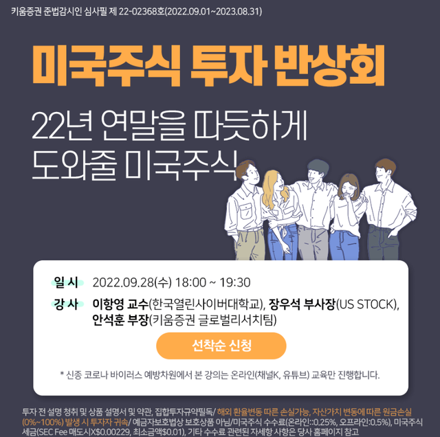 키움증권은 오는 28일 저녁 6시부터 미국주식 투자반상회를 개최한다고 27일 밝혔다.이번 강의는 한국열린사이버대학교 이항영 교수, 유에스스탁 장우석 부사장, 키움증권 글로벌리서치팀 안석훈 팀장이 진행을 맡는다.이 회사는 성공적인 투자를 위해 매월·매분기 투자세미나를 개최하고 있다.이날 세미나는 회사 유튜브 ‘키움증권 채널K’ 또는 홈페이지를 통해 시청이 가능하다.