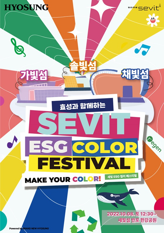 효성이 세빛섬에서 시민들 참여로 진행되는 대규모 친환경 축제를 연다.효성은 내달 8일 서울시 서초구 세빛섬 일대에서 '효성과 함께하는 세빛 ESG 컬러 페스티벌(Sevit ESG Color Festival)'을 개최한다고 30일 밝혔다. 이번 페스티벌에는 서울 시민 1500여 명이 참여할 것으로 예상된다.㈜세빛섬이 주최하고 효성이 후원하는 이번 페스티벌은 회색 빛의 서울 빌딩 숲 사이에서 친환경 활동을 통해 세빛섬과 한강공원 일대를 환경과 조화를 이루는 다채로운 색깔들로 바꾸어 나가자는 의미에서 마련됐다.세빛 ESG 컬러 페스티벌은 효성의 친환경 비전을 담은 'Make Your Color(우리의 친환경 색깔을 찾아 다 함께 달려가)'는 슬로건에 따라 7가지 색깔(블루, 그린, 화이트, 오렌지, 옐로, 퍼플, 핑크)을 테마로 각각의 의미에 맞는 친환경 프로그램으로 진행된다.효성은 이번 페스티벌로 효성의 친환경 미래 기술을 소개하는 동시에 세빛섬이 시민들의 새로운 친환경 테마 공간으로 자리잡는 계기가 될 것으로 기대하고 있다.참가자들은 ▲리젠으로 만든 티셔츠를 입고 한강을 걷는 '세빛 리젠 워크' ▲세빛섬 반포 한강공원 일대에 버려진 쓰레기를 수거하는 '세빛 리젠 플로깅' ▲친환경을 주제로 진행되는 '세빛 한강 요가 클래스' ▲예빛섬 야외 무대에서 국내 유명 DJ, 록밴드, 가수 등과 함께하는 '세빛 뮤직 콘서트' 등에 참여할 수 있다.이와 함께 효성의 친환경 활동을 한눈에 볼 수 있는 '효성 리젠존'과 ▲탑텐 밸런스 ▲큐클리프 ▲동구밭 ▲라이트브라더스 등 국내 친환경 대표 브랜드를 소개하는 '친환경 브랜드존'도 운영된다.현장에서 진행되는 이벤트를 참여하면 효성의 대표 리사이클 섬유인 '리젠'으로 만든 친환경 가방과 티셔츠 등 경품도 증정한다.조현준 효성 회장은 "친환경 활동은 기업 경영과 삶에서 이제 떼려야 뗄 수 없는 필수 불가결한 요소가 됐다"며 "이번 세빛 ESG 컬러 페스티벌이 친환경이 우리 삶에 더욱 친밀하고 자연스럽게 다가오는 계기가 되길 기대한다"고 말했다. 이어 "효성도 국내 친환경 경영을 이끌어가는 대표 주자로 자리매김하겠다"고 밝혔다.