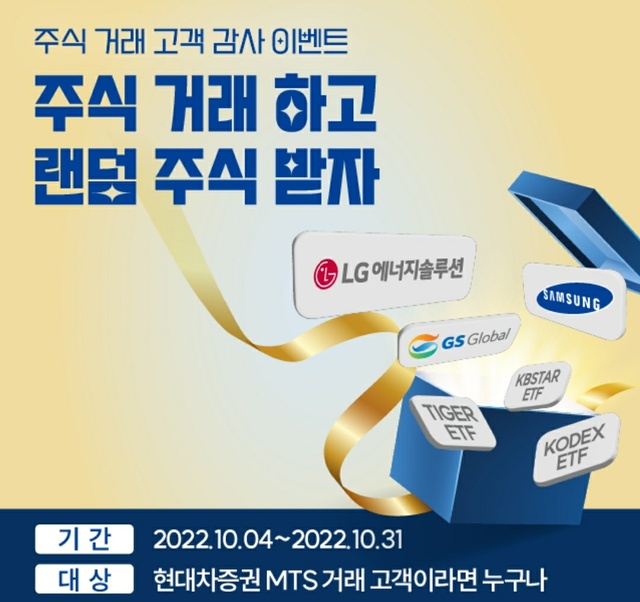 현대차증권은 이달 4일부터 31일까지 MTS로 거래하는 고객들을 대상으로 국내 주식 또는 ETF를 증정하는 룰렛 이벤트를 진행한다고 5일 밝혔다.이번 이벤트는 주식 거래로 획득한 응모권을 통해 룰렛 이벤트에 참여하는 방식으로, 룰렛 응모권은 거래 금액 300만원당 1매씩 증정한다. 국내 주식, 해외 주식 뿐만 아니라 ETN, ELW를 거래해도 응모권을 받을 수 있다.참여를 원하는 고객은 MTS 이벤트 페이지에서 신청을 완료한 후 획득한 응모권으로 룰렛을 진행하면 된다. 당첨된 고객은 LG에너지솔루션, 삼성전자, KODEX 증권 등 국내 주식 및 ETF 5종 중 1종을 랜덤으로 받을 수 있다.신규 고객 및 휴면 고객(최근 1년간 주식 거래가 없는 고객)을 대상으로 국내 주식 또는 ETF를 100% 증정하는 이벤트도 진행 중이다. 이들 고객이 10월 한 달간 100만원 이상 주식을 거래하면 LG디스플레이, 쇼박스, TIGER 여행레저 중 1종을 랜덤으로 받을 수 있다.이밖에 이번 이벤트와 관련된 자세한 사항은 회사 홈페이지 및 스마트금융센터로 문의하면 된다.