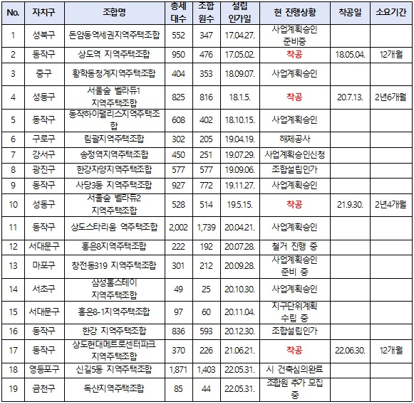 19개 서울 지역주택조합중 실제 착공까지 이른 곳은 단 4곳에 불과한 것으로 나타났다.지역주택조합사업은 지역주민들이 조합을 설립한뒤 사업주체가 돼 토지를 매입하고 등록사업자와 협약을 맺어 공동으로 아파트 건설을 추진하는 방식이다.정동만 국민의힘 국회의원이 서울시로부터 받은 '지역주택조합 현황자료'에 따르면 지난 2017년이후 설립인가를 받은 지역주택조합은 총 19곳으로 연도별로 보면 △2017년 2곳 △2018년 3곳 △2019년 5곳 △2020년 6곳 △2021년 1곳 △2022년 2곳이다.그러나 이중 실제 착공까지 이른 곳은 동작구 2곳과 성동구 2곳으로 총 4곳이 전부다. 동작구 2곳의 경우 각각 2017년, 2021년에 지역주택조합 설립인가를 받은후 1년만에 착공됐고 성동구 2곳은 설립인가후 착공까지 각각 2년4개월, 2년6개월이 소요됐다.