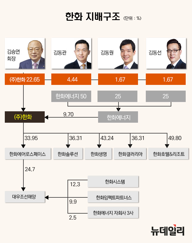 현재 ㈜한화의 주요 주주는 김승연 회장(22.65%), 김동관 부회장(4.44%), 김동원 부사장(1.67%), 김동선 상무(1.67%) 등이다.