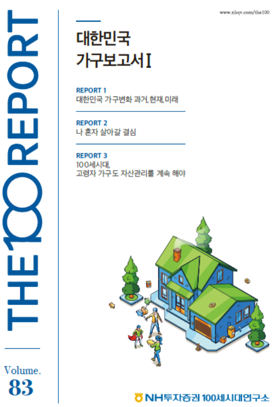 NH투자증권 100세시대연구소는 THE100리포트 83호 ‘대한민국 가구보고서’ 1편을 발간했다고 31일 밝혔다.대한민국 가구보고서는 총 2편에 걸쳐 발간할 예정이다. 이번에 발간한 1편에서는 통계청 자료를 바탕으로 3가지 주제로 나눠 최근 우리나라 인구 및 가구구조 변화의 트랜드와 향후 예상되는 변화를 전망, 이에 따른 생애자산관리의 가이드가 될 수 있는 내용을 담았다.‘대한민국 가구변화 과거, 현재, 미래’에선 가구의 초핵가족화, 고령화, 여성화, 다양화라는 추세에 맞춰 노후 준비 재점검 필요성을 강조했다.‘나 혼자 살아갈 결심’에선 우리 사회의 대표적 가족형태가 된 1인 가족의 특징과 경제적·정서적 어려움, 자산관리 원칙을 제안했다.‘고령자가구도 자산관리를 계속 해야’에선 65세 이상의 고령자가구의 재무 건전성과 노후 준비 현황 등에 대해 알아보았다.김진웅 NH WM마스터즈 수석연구위원·100세시대연구소장은 "우리나라의 가구경제 변화를 살펴보면 경제적 역량이 지속적으로 성장하고 있음을 알 수 있다"며 "다만 가구형태가 세분화되고 다양해지고 있으므로 각자 처한 상황에 맞춰 실질적 도움이 될 수 있도록 가구유형별 자산관리 리서치를 심화시켜 나가겠다"고 밝혔다.