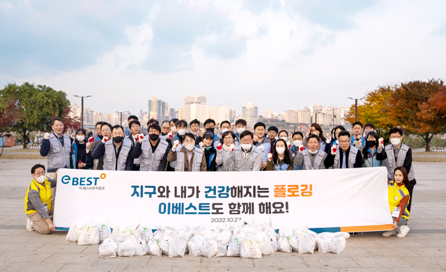 이베스트투자증권은 사회 공헌 활동 일환으로 플로깅 행사를 진행했다고 14일 밝혔다.플로깅(Plogging)은 산책이나 조깅을 하면서 쓰레기를 줍는 활동을 뜻한다.이베스트투자증권 임직원 100여 명은 지난달 24일, 27일 양일 간 여의도 한강공원 일대에서 플로깅을 진행했다.회사 관계자는 “사회 공헌과 직원 소통을 동시에 할 수 있는 활동으로 플로깅을 기획했다”라며 “앞으로도 임직원들의 자발적인 대면 사회공헌 활동을 확대해 나갈 예정”이라고 말했다.