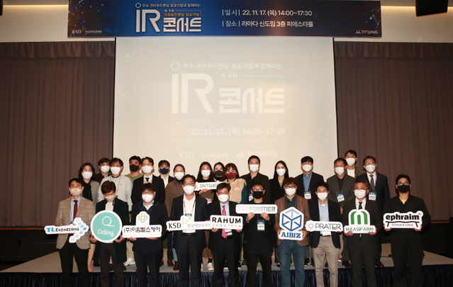 한국예탁결제원은 지난 17일 서울 구로구 라마다서울신도림호텔에서 크라우드펀딩 성공기업의 후속자금 조달을 지원하기 위한 '제9회 크라우드펀딩 성공기업 IR콘서트'를 개최했다고 18일 밝혔다.이날 행사엔 티엘엔지니어링 등 크라우드펀딩 성공기업 9개사와 포스코기술투자, 블루포인트파트너스 등 전문투자자 40여명이 참석했다.행사는 현장과 비대면(유튜브 채널) 방식으로 개최됐으며, 사전에 엄정한 기준에 의해 선발된 9개 펀딩 성공기업의 IR발표에 이어 벤처캐피탈(VC), 기관투자자 등 전문투자자들의 질의와 투자의향서 제공, IR기업과 투자자 간 네트워킹 등의 순서로 진행됐다.이명호 사장은 인사말을 통해 "정례적으로 개최하는 IR콘서트가 성공기업의 투자 유치에 실직적인 도움이 될 수 있도록 더욱 노력하고 혁신창업 지원을 지속적으로 강화하겠다"면서 "증권형 크라우드펀딩 시장 활성화를 위해 정책당국의 제도개선을 적극 지원해나갈 계획"이라고 밝혔다.IR콘서트에 참가한 펀딩 성공기업의 한 대표는 "금리인상 등 대내외 여건 변화로 창업기업에 대한 투자환경이 크게 위축됐지만 어려운 여건 속에서도 창업기업들은 위기를 기회로 바꿔가고 있다"며 "이번 IR콘서트를 통해 회사가 한 단계 더 성장하기를 바란다"고 말했다.