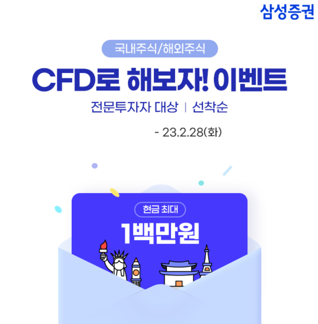 삼성증권은 전문투자자를 대상으로 '국내주식·해외주식 CFD로 해보자!' 이벤트를 내년 2월 28일까지 진행한다고 21일 밝혔다.우선 신규 개설한 CFD 계좌에서 1주만 거래해도 이마트·GS칼텍스 상품권 2만원권을 증정한다. 국내CFD는 선착순 100명, 해외CFD는 선착순 30명으로, 국내·해외 각각 CFD 계좌 거래 조건 달성시 중복 지급이 가능하다.또한 신규 CFD 계좌 거래 금액에 따라 현금 최대 100만원을 지급한다. 10억원 이상 거래 시 10만원을, 50억원 이상 거래 시 50만원을 선착순 지급한다. 두 가지 이벤트는 중복이 가능하다.CFD(Contract For Difference)는 고객이 실제 주식을 직접 보유하지 않고, 가격 변동을 이용한 차익을 목적으로 매매하며 진입가격과 청산가격의 차액을 현금으로 결제하는 장외파생거래를 의미한다. 레버리지 활용을 할 수 있고, 차입공매도가 가능하여 주식을 거래하는 투자자들의 CFD에 대한 관심도 높아지고 있다.CFD를 활용하면 투자자 입장에서 다양한 방식의 투자가 가능하다. CFD 증거금율이 40~100%이기 때문에 개별종목을 최대 2.5배로 레버리지 투자할 수 있다. 과도하게 상승하거나 하락이 예상되는 종목을 공매도해 주가 하락 시 수익을 추구하는 방식으로도 투자가 가능하다.회사 관계자는 "최근 변동성이 높아지는 주식시장에서 다양한 전략을 구사하고자 하는 전문 투자자들에게 좋은 투자의 수단이 될 것"이라며 "높은 활용도만큼 비용과 위험에 대한 충분한 고려 후 투자하길 바란다"고 말했다.