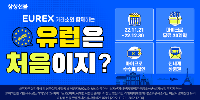 삼성선물은 유럽파생상품거래소(EUREX)와 협업으로 마이크로지수상품 2종(마이크로 닥스·마이크로 유로스톡스50)에 대한 무료 수수료 및 수수료 할인 이벤트를 실시한다고 21일 밝혔다.이벤트는 내달 30일까지 6주간 진행되며, 이 회사 해외선물 계좌를 보유한 고객이라면 누구나 신청이 가능하다.신청 고객은 이벤트 기간 내 마이크로지수상품 2종을 30계약까지 무료로 거래할 수 있고, 이후 연말까지 해당 종목들의 수수료를 50% 할인된 1유로로 거래할 수 있다.거래량 구간에 따른 혜택도 제공된다. 거래량 구간에 맞춰 10계약 이상 1만원, 30계약 이상 3만원, 50계약 이상 5만원의 신세계백화점 상품권이 제공된다. 올해 8월 이후부터 이벤트 종목의 거래가 없었던 신규 고객은 1계약만 거래해도 신세계상품권 3만원이 제공된다.이 회사는 국내 개인투자자의 해외선물 거래 상품 다양화를 위해 이벤트를 개최했다. 앞서 삼성선물은 올해 거래상품 다양화를 위해 싱가폴거래소 및 ICE거래소와도 협업 이벤트를 진행한 바 있다.회사 관계자는 "최근 대외변수의 영향으로 유럽 금융시장의 변동성이 높은 만큼 미국시장 이외의 시장에도 관심을 가질 만하다"며 "새롭게 EUREX 상품을 거래하고자 하는 고객들이 부담 없이 참여할 수 있도록 본 이벤트를 기획했다"고 말했다.