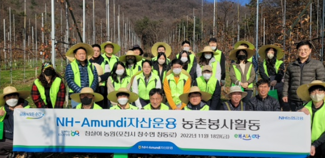 NH아문디자산운용은 임직원 20여명이 지난 18일 경기도 포천시 참살이농원 사과농가에 방문해 사회공헌활동을 실시했다고 22일 밝혔다.농원을 찾은 임직원들은 내년 사과 농사를 위해 사과밭에 깔린 반사판을 제거하고 과원을 정리하는 등 일손이 부족한 농가를 도왔다.이 회사의 농촌일손돕기는 올해 들어 다섯 번째다. 지난 10월에도 자매결연마을인 포도향이 흐르는 마을에서 포도 수확, 해충 방지표 부착 및 농장 청소 등의 일손 돕기를 실행한 바 있다.이번 일손돕기에 참여한 회사 관계자는 “지역 농가의 일손부족에 대해 조금이나마 도움을 줄 수 있어 기쁘다”며 “앞으로도 지역사회와의 동반성장 실현을 위해 농촌일손돕기 등의 사회공헌활동에 적극적으로 참여할 것”이라고 말했다.박학주 대표는 “농업 농촌 및 지역사회와 함께 동반성장을 하는 ESG경영에 앞장서기 위해 지속적인 사회공헌활동을 진행할 계획”이라며 “친환경 저탄소 지향 투자를 강화하는 등 국내 ESG 선도 운용사로서 최선을 다하겠다”고 말했다.