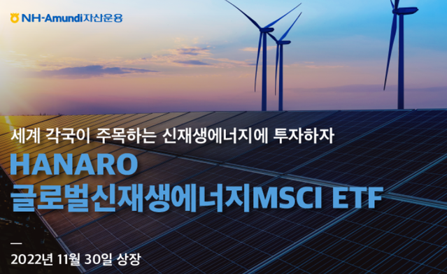 NH아문디자산운용은 HANARO 글로벌신재생에너지MSCI 증권상장지수투자신탁(ETF)을 오는 30일 상장한다고 23일 밝혔다.이는 2050년 넷제로(탄소를 배출한 만큼 다시 흡수해 온실가스 배출량을 제로로 만드는 것) 달성이 글로벌 화두로 떠오르는 가운데 신재생에너지에 대한 투자가 확대됨에 따라 개발됐다.이 ETF는 MSCI가 발표하는 MSCI ACWI IMI New Energy ESG Filtered를 기초지수로 추종한다. 대체에너지, 에너지효율, 배터리 및 스마트 그리드 관련 업체로 구성되며 이 중 ESG 점수가 낮은 종목은 제외한다.총 21개국에 투자하며 대표 편입 종목은 미국의 인페이즈 에너지(4.26%), 솔라엣지(3.53%), 플러그 파워(3.11%) 등이 있으며 대한민국 기업 중에서는 삼성 SDI(2.12%), LG에너지솔루션(1.77%) 등이 있다.고숭철 주식운용총괄CIO는 "ESG의 대두로 친환경 투자가 대세가 된데다 원자재가격 급등과 인플레이션 상승에 따라 여느 때보다 신재생에너지의 성장성에 전 세계가 주목하고 있다"며 "HANARO 글로벌신재생에너지MSCI ETF는 ESG 조건에 부합하는 기업으로만 구성한 차별화된 상품으로 친환경·신재생 에너지에 투자하는 좋은 수단이 될 것"이라고 말했다.한편 이 회사는 ESG 투자 및 글로벌 그린 투자 확대에 발맞춰 ‘HANARO 글로벌워터MSCI ETF’, 'HANARO Fn친환경에너지 ETF'뿐 아니라 '100년 기업 그린 코리아 펀드', ‘올바른 지구 OCIO 자산배분 펀드’ 등 펀드 상품에 이르기까지 ESG 관점에서 개발된 저탄소, 친환경 관련 상품 라인업을 갖추고 있다.