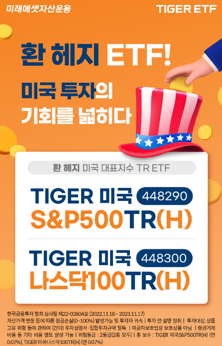 미래에셋자산운용은 오는 25일 한국거래소에 신규 상장하는 ‘TIGER 미국S&P500TR(H) ETF’와 ‘TIGER 미국나스닥100TR(H) ETF’ 거래 고객을 대상으로 이벤트를 진행한다고 23일 밝혔다.TIGER 미국S&P500TR(H) ETF는 미국 대표 지수인 S&P500에 투자하는 환헤지형 ETF다. 해당 지수는 현재 미국 주식시장 전체 시가총액 약 80%에 해당하는 대형주들을 포함해 전반적인 미국 경제 상황을 반영한다.TIGER 미국나스닥100TR(H) ETF는 환헤지형 상품으로, 미국의 글로벌 기술을 선도하는 시가총액 상위 100대 기업으로 구성된 나스닥100 지수에 투자한다. 해당 지수에 포함된 IT, 소프트웨어, 생명공학 등 혁신 분야 기업들은 세계 기술을 주도하며 미국 경제와 함께 장기적인 성장이 전망된다.환헤지형 상품인 해당 ETF 2종은 원-달러 환율 변동에 영향을 받지 않아 환율 리스크를 축소하고, 변동성을 감소시키는 효과가 있다. 투자자는 원화로 투자하므로 투자 시 환전이 필요 없다.해당 ETF 2종은 퇴직연금으로도 활용 가능하다. 국내 상장된 기존 S&P500, 나스닥100 ETF 중 환헤지형은 대부분 지수 선물로 운용돼 퇴직연금 계좌에서 매매가 불가능했지만 해당 ETF 2종은 주식 현물로 운용돼 매매가 가능하다. 특히 TIGER 미국나스닥100TR(H) ETF의 경우 국내 최초 나스닥100 지수를 추종하는 실물형 환헤지 ETF로, 개인연금과 퇴직연금 계좌에서 모두 투자 가능하다.기초지수는 각각 S&P500, 나스닥100 총수익지수(Total Return Index)다. 총수익지수는 현금배당 재투자를 가정하고 산출된 지수다. 해당 ETF는 배당금을 자동으로 재투자해 과세이연과 복리효과로 장기투자 시 수익률 극대화를 추구, 연금 투자자들의 수요를 충족시킬 수 있을 것으로 예상된다.이벤트는 해당 ETF 2종 거래 고객을 대상으로 이달 25일부터 12월 16일까지 유진투자증권, KB증권에서 진행된다.유진투자증권은 대상 ETF 2종 합산 일간 3억원 이상 거래 고객 선착순 10명에게 문화상품권 5만원을 지급한다. KB증권은 대상 ETF 거래 고객 중 각각 일간 3억원 이상 거래 고객 중 추첨을 통해 10명에게 문화상품권 5만원을 지급한다. 자세한 이벤트 내용은 각 증권사 홈페이지에서 확인할 수 있다.