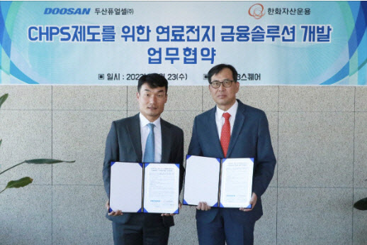 한화자산운용은 23일 두산퓨얼셀과 서울 63스퀘어에서 'CHPS제도를 위한 연료전지 금융솔루션 개발 업무협약(MOU)'을 체결했다고 밝혔다.양사는 이번 협약으로 연료전지 특화 금융서비스 투자 기회 확대에 본격적으로 나선다.이번 협약은 새롭게 시행 예고된 청정수소발전의무화제도(CHPS)에 부응하고 어려운 금융환경에서도 원활한 재원 조달에 기여할 수 있는 금융서비스 제공이 필요하다는 각 사의 공통된 인식을 바탕으로 이뤄졌다.CHPS이란 기존 재생에너지공급의무화(RPS) 제도에서 수소발전을 분리, 수소발전의 특성에 부합하는 지원체계를 마련하고 수소발전을 위한 청정수소 사용을 촉진하기 위해 추진되는 정책이다.한화운용 측은 현재 관련법 개정 및 시행령 수립으로 내년부터 제도가 도입되면 글로벌 에너지 시장의 주축으로 성장하고 있는 연료전지를 비롯한 수소발전 시장 활성화에 크게 기여할 것으로 전망하고 있다.이번 양사간 협약의 주요 내용은 ▲CHPS제도 모니터링을 통한 최적의 금융솔루션 도출 ▲두산퓨얼셀이 직접 참여하는 연료전지에 특화된 블라인드 펀드 출시 ▲고객들의 니즈에 부합할 수 있는 금융서비스 제공 등이다.이를 바탕으로 정부 정책의 성공적인 안착에 기여하고 두산퓨얼셀이 제품 관련 서비스뿐만 아니라 금융서비스까지 제공하는 종합 솔루션 시스템을 구축하겠다는 방침이다.허경일 한화운용 인프라사업본부장은 "그동안 해온 신재생에너지 분야에 대한 적극적인 투자와 함께 다양한 에너지 분야 금융서비스에서의 경험을 바탕으로 CHPS 제도와 두산퓨얼셀 연료전지에 특화된 금융솔루션을 개발할 것”이라며 “향후 펀드 조성과 운용을 총괄하는 역할을 맡을 예정"이라고 말했다.