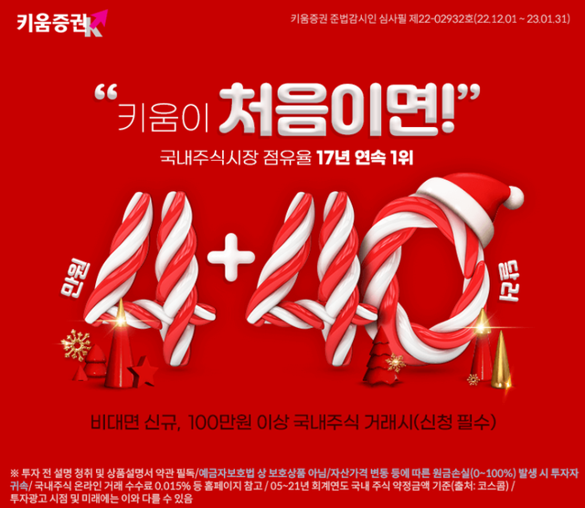 키움증권은 비대면 주식 계좌를 처음 개설한 고객들을 대상으로 현금 최대 4만원을 증정하는 이벤트를 내년 1월 31일까지 진행한다고 1일 밝혔다.이벤트 기간 동안 최초 비대면 주식 계좌를 개설한 고객 중 국내 주식(ETF, ETN 포함)을 1만원 이상 거래한 고객에게 현금 1만원, 100만원 이상 거래한 고객에게 추가 3만원을 지급한다.이와 더불어 미국주식을 한 번도 거래하지 않은 고객에게 미국주식 투자 지원금 40달러를 증정한다. 또한 타사 계좌에서 키움증권 계좌로 주식 입고 시 최대 현금 115만원을 증정한다.