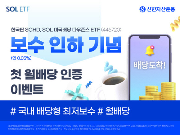 신한자산운용은 'SOL 미국배당 다우존스 ETF'의 첫 월배당 지급 기념 인증 이벤트를 진행한다고 6일 밝혔다.이벤트는 SOL ETF 블로그에서 진행된다. 이벤트 페이지에 SOL 미국배당다우존스ETF 월배당 인증사진과 함께 이름과 연락처를 등록한 총 300명에게 선착순으로 스타벅스 아메리카노 2잔 기프티콘을 지급한다.회사는 이와 함께 SOL 미국배당 다우존스의 연 총보수를 0.15%에서 0.05%로 인하한다. 저렴한 보수를 통해 국내 ETF 투자자의 투자 접근성 확대와 장기 복리 수익률 극대화에 도움을 줄 것으로 기대하고 있다.SOL 미국배당다우존스는 미국 대표 배당성장 ETF인 SCHD에 월배당 전략을 추가한 상품이다. 상장 2주 만에 150억원이 유입되며 투자자의 관심을 끌고 있다.이벤트 진행 기간은 오는 1월 2일부터 13일까지다. 투자자는 분배금 지급기준일인 올해 12월 30일까지 SOL 미국배당다우존스 ETF를 매수해 보유하면 된다. 분배금은 2023년 첫 영업일인 1월 2일 지급된다.자세한 내용은 SOL ETF 블로그를 통해 확인하면 된다.