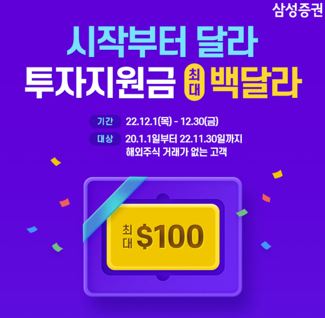 삼성증권은 신규 고객과 해외주식 거래 경험이 없었던 기존 고객을 대상으로 최대 100달러를 지원하는 이벤트를 12월 30일까지 진행한다고 6일 밝혔다.이번 이벤트는 해당 고객을 대상으로 투자지원금 20달러를 지급하고, 이후 온라인 해외주식 거래금액에 따라 추가로 최대 80달러에 달하는 거래축하 지원금을 단계별로 지급한다.투자지원금은 이벤트 참여 신청 시 즉시 신청 계좌로 입금되며, 입금된 20달러는 입금된 날로부터 5영업일 이내에 미국 주식 매수금으로 사용 가능하다.미국주식을 매수하지 않을 경우 투자지원금은 신청일을 기준으로 6영업일 이후 자동으로 출금된다.이후 거래축하 지원금은 내녀 1월 31일까지 온라인으로 해외주식을 일정 금액 이상 거래해 단계별 기준을 모두 충족했을 시 최대 80달러를 받을 수 있다.온라인으로 해외주식을 100만원 이상 거래 시 10달러, 1000만원 이상 거래 시 20달러, 1억원 이상 거래 시 30달러, 마지막으로 2억원 이상 거래 시 20달러가 내년 2월 2일 입금된다.지원금은 내년 2월 23일까지 미국주식 매수금으로 사용 가능하며, 매수하지 않은 지원금은 2월 24일 이후 자동 출금된다.이벤트 참여를 위해서는 회사 홈페이지 또는 모바일앱 엠팝(mPOP)에서 기간 내 참여 신청해야 한다. 주말에는 신청이 불가하며, 매일 오전 8시부터 오후 11시까지 가능하다.