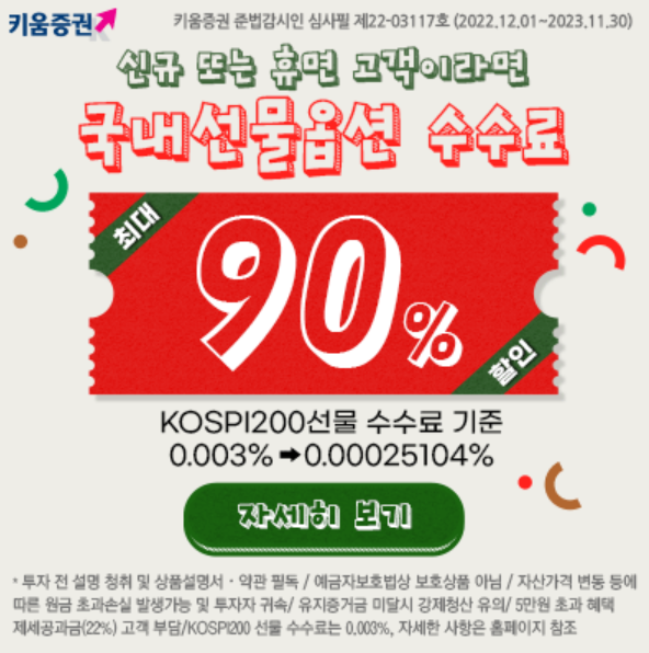 키움증권은 신규 및 휴면 고객 대상으로 국내선물옵션 수수료 최대 90% 할인 이벤트를 내년 3월 3일까지 진행한다고 6일 밝혔다.이벤트 참여 대상은 12월 1일 이후 선물옵션 계좌를 최초 개설한 신규 고객과 올해 6월 3일 이전에 선물옵션 계좌를 개설한 고객 중 6월 4일부터 6개월간 선물옵션 거래가 없었던 휴면 고객이다.해당 고객은 이벤트 신청 후 비대면 계좌 기준 2개월 동안 수수료 할인을 받을 수 있다.비대면 계좌 기준으로 수수료 할인 적용기간 동안 선물 400억원 이상 또는 옵션 13억원 이상 거래금액 충족 시 추가 2개월을 적용 받을 수 있어 최대 4개월간 할인받을 수 있다.해당 수수료 할인은 유관기관 수수료만 납부하게 돼 코스피200선물 기준 약 90%의 수수료 비용 절감이 가능하다. 또한 타사거래확인서 등록 후 이벤트 기간 내 선물옵션 최초 거래 시 현금 10만원을 증정한다.이벤트에 관한 자세한 내용은 회사 홈페이지나 키움금융센터를 통해 확인할 수 있다.