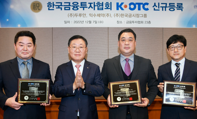 금융투자협회는 7일 ㈜두루안, 익수제약㈜, ㈜한국금시장그룹의 K-OTC시장 신규등록을 승인하고 오는 9일부터 거래가 시작된다고 밝혔다.㈜두루안은 2007년 10월에 설립돼 네트워크 통합 보안솔루션, 백업솔루션 등의 제품을 공급하는 정보보호 소프트웨어 중소기업이다.회사 관계자는 “네트워크 방화벽에서 DI&C 기술과 국내 유일의 Cloud 서비스 기술 등을 보유하고 있어 K-OTC 등록을 계기로 회사를 알리고 성장의 발판을 다질 것”이라고 말했다.익수제약㈜는 1970년 9월에 설립돼 전국 5000여개 약국에 우황청심원, 공진단 등 의약품을 공급하는 중소기업이다.회사 관계자는 “K-OTC시장을 통해 안정적 투자 유치를 기대하고, 향후 한약신약 연구개발에 더욱 매진할 것”이라고 밝혔다.㈜한국금시장그룹은 2020년 2월에 설립돼 귀금속 세공 등 주얼리 제품을 개발, 제조, 판매하는 중소기업이다 .회사 관계자는 “향후 연구개발을 통해 자사 브랜드인 ‘스태리주얼리(starry jewelry)’를 세계적인 브랜드로 성장시키는데 최선을 다 할 것”이라고 전했다.신규등록 기업들은 오는 9일부터 증권사 HTS 등을 통해 거래할 수 있다.첫 거래일에는 주당 순자산가치의 30∼500% 범위에서 거래 가능하며 이후 가격제한폭은 전일 가중평균주가의 ±30%이다.
