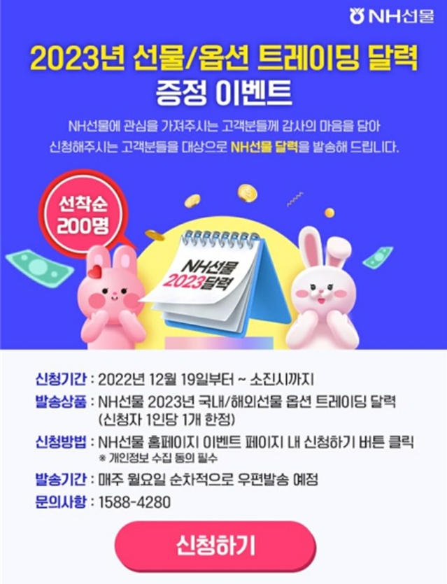 NH선물은 2023년 국내외 선물 옵션 트레이딩 달력 무료 증정 이벤트를 진행한다고 21일 밝혔다.트레이딩 달력에는 한국거래소를 비롯해 CME, EUREX, HKEX, ICE, JPX, SGX 등 주요 해외 거래소의 상품별 만기일과 휴장일을 담고 있다.매매에 참고할 만한 주요 거시 경제지표 일정도 한곳에 표기했다.이번 이벤트는 NH선물 고객뿐만 아니라 누구나 신청 가능하며 선착순 200명까지 혜택을 받을 수 있다.신청은 회사 홈페이지 이벤트 페이지 내 신청하기 버튼을 클릭하면 가능하다.