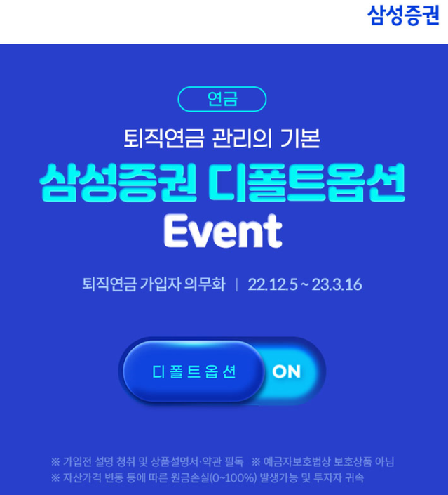 삼성증권은 내년 3월 16일까지 퇴직연금 디폴트옵션 시행에 맞춰 '당신의 퇴직연금, 디폴트옵션 ON or OFF' 이벤트를 진행한다고 22일 밝혔다.이벤트는 총 세 가지로, 이에 참여하려면 먼저 신청해야 한다.퇴직연금 DC형·IRP(개인형퇴직연금) 고객을 대상으로 퇴직연금계좌의 주소·휴대폰번호·이메일주소 중 한 가지와 투자자정보확인서를 등록 또는 재등록한 고객 중 추첨을 통해 3000명에게 편의점 상품권(2000원)을 제공한다.올해 12월 4일 이전에 입금 내역이 없는 이 회사 IRP 고객 또는 12월 5일 이후 IRP를 신규 개설하고 최초 입금 전인 고객을 대상으로, 디폴트옵션 상품을 사전 지정하면 된다. 이벤트 참여 고객 중 추첨을 통해 1000명에게 커피 기프티콘을 제공한다.이 회사 IRP 고객이 삼성증권 디폴트옵션 상품을 100만원 이상 사전지정 방식 또는 직접 순매수하면 추첨을 통해 1000명에게 백화점 모바일 상품권 1만원을 제공한다.회사는 안정성과 저렴한 보수를 최우선으로 고려해 디폴트옵션 상품을 구성했다. 시황에 따라 단기에 높은 수익을 기대할 수 있는 상품이 아닌 장기간 꾸준한 수익이 기대되는 포트폴리오의 형태로서, 가입자의 성향에 따른 5개의 상품 모두 2개 이상의 상품이 결합된 포트폴리오다.이번 이벤트와 관련 자세한 사항은 회사 홈페이지 또는 패밀리 센터에서 확인할 수 있다.
