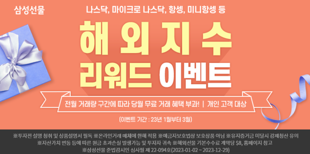 삼성선물은 해외선물 투자자를 대상으로 3가지 종류의 새로운 이벤트를 진행한다고 4일 밝혔다.회사 측은 이번 이벤트와 관련 "PTP 과세 문제에 대한 투자대안으로 해외선물 직접투자를 제안하는 것"이라면서 "투자자들이 보다 쉽게 해외선물시장에 접근할 수 있도록 저렴한 수수료와 혜택을 제공하고자 한다"고 밝혔다.해외선물은 레버리지가 커서 투자위험이 높다고 생각할 수 있으나 증거금을 충분히 넣고 거래하면 2배나 3배 ETF와 동일한 효과를 얻을 수 있어 ETF 과세에 대한 대안으로 충분히 고려할 만하다는 게 회사 측 설명이다.금번 이벤트는 3가지 종류로 투자자들의 니즈에 따라 선택하면 되며, 중복 신청이 가능하다.첫번째 이벤트는 신규고객 대상이며, 나스닥, 항셍 등 해외지수 종목 거래시 매월 종목에 따라 10계약에서 100계약까지 무료수수료를 제공하고, 수수료는 CME(시카고상품거래소) 지수종목은 2달러, CME 지수 외 상품은 2.5달러, 홍콩거래소 지수종목은 30홍콩달러로 할인된 수수료 혜택이 제공된다.혜택기간은 6월까지이며, 생애 최초 신규고객은 계좌개설시 스타벅스 아이스아메리카노 1잔, 첫 거래시 신세계 상품권 2만원도 제공된다.또한 신규고객의 경우 CME 원자재 상품을 1월에 거래하고, 2월에도 거래하면 주유상품권 2만원을 제공한다.신규 및 기존고객 여부와 상관없이 삼성선물에 계좌가 있는 고객 누구나 전월 거래실적에 따라 일정 수준의 무료 수수료가 다음달에 제공된다.